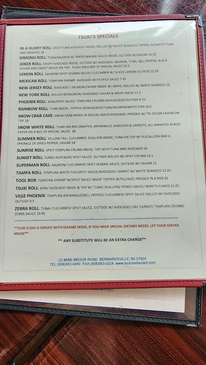 Lastly, for something truly unique, Tsuki's specials stand out. The In A Hurry Roll, Kimono Roll, and Joker Roll offer distinct flavors that cater to those seeking a more creative dining experience. Other exciting choices like the Lemon Roll and Mexican Roll bring fresh takes on traditional Japanese sushi.