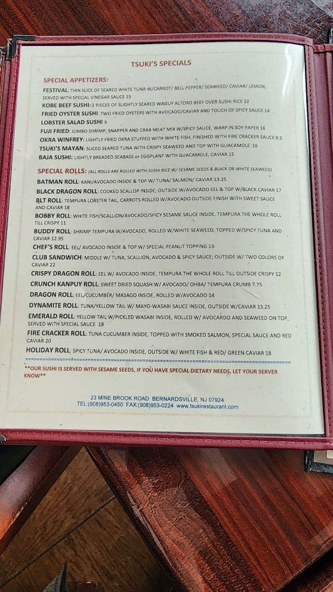 The special rolls at Tsuki are uniquely crafted and full of flavor. Notable rolls include the bold Batman Roll, the smoky Black Dragon Roll, and the satisfying Bobby Roll. If you're looking for something more playful, try the Buddy Roll or the Charley Box for an adventurous twist.