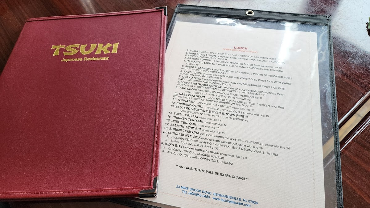 For those who enjoy grilled dishes, Tsuki offers a variety of teriyaki options, including the savory Pork Miso Yaki, tender Chicken Teriyaki, and the rich Salmon Teriyaki. Vegetarians can also enjoy the Tofu Teriyaki, which provides a satisfying alternative.